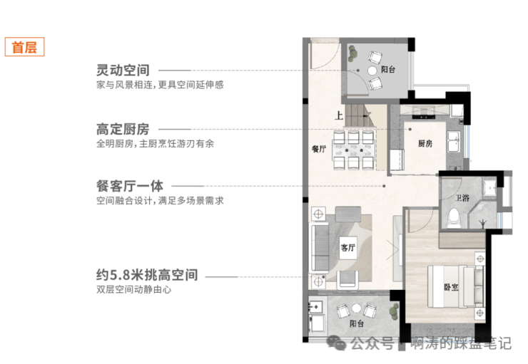项目建面约 98-107㎡复式产品,凭借 5.8 米超高挑空层高,实现上下双层独立空间划分,动静分层设计,下层规划客厅、餐厅、厨房、公共卫生间,满足日常社交、居家活动;上层规划卧室、独立休憩区,保障居住安静度,完美实现墅式生活体验。超高空间利用率,搭配入户花园、全景飘窗、设备平台多重赠送空间,整体实用率高达 120%,98㎡建筑面积就能打造大四房格局,空间远超同面积段平层产品。