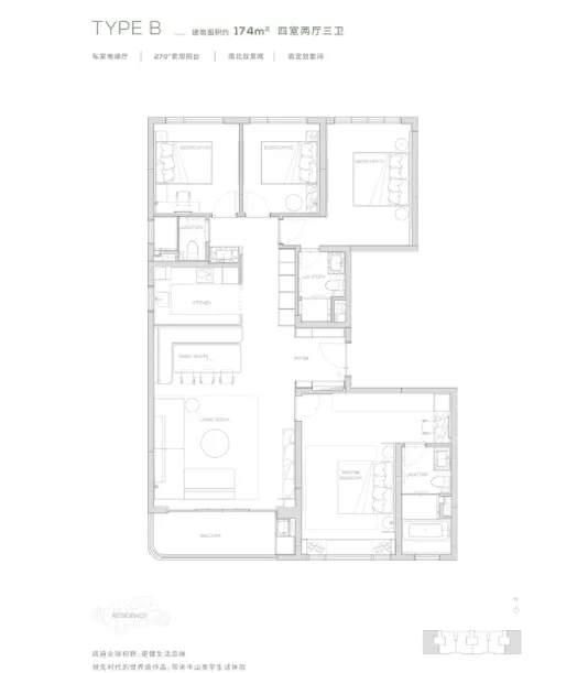 2. 174㎡四房三卫:空间舒展,适配多人口家庭