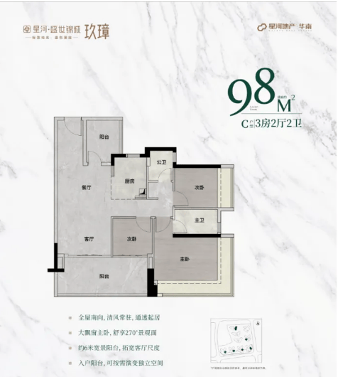 98㎡户型:全新升级设计,主朝向朝南,让阳光洒满每一个角落,告别潮湿阴暗。主卧配备270°无柱飘窗,视野开阔,推窗即可欣赏社区园林美景;次卧和阳台尺度大幅增加,提供更加舒适的居住体验,无论是休闲娱乐还是晾晒衣物都更加从容,适合刚需小家庭居住。