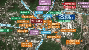 区位分析: 大壮名城位于科学城“政务-商业-产业”黄金三角中心,3公里内覆盖: ▸产业:雪松控股、多益网络等7大总部基地,超20万高薪人群; ▸政务:黄埔区政府、政务服务中心; ▸商业:自身20万㎡商业综合体+万达广场(车程8分钟)。