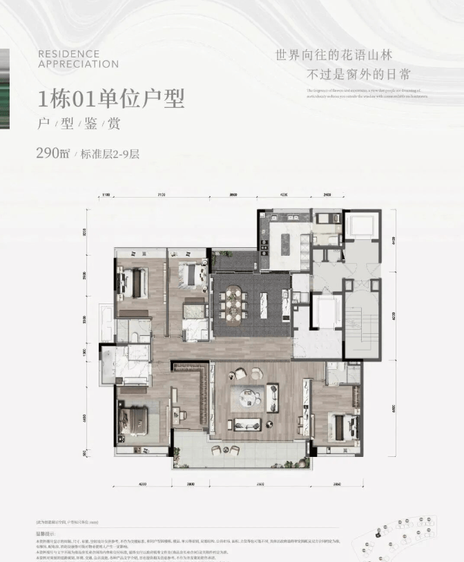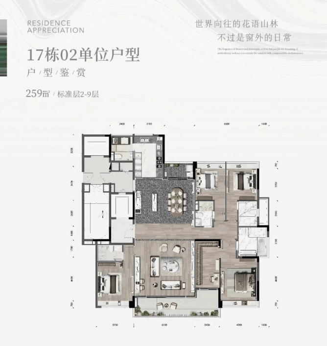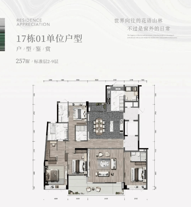 合景臻颐府主要推出建面约260-350平方米的巨幕畔山大平层,以及建面约235-273平方米的南北双庭院院墅。每户层高约为3.2~3.5米,比一般楼盘高出二三十厘米,带来更加开阔的空间感。