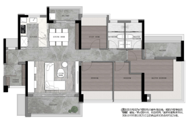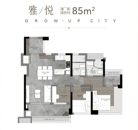 103㎡四空间两卫:适合作为三代同堂的家庭住房,五开间采光,开放式厨房,转角阳台,配备阳光梳妆台和衣帽间。