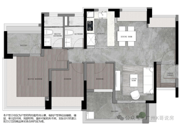75㎡三空间两卫:适合年轻夫妇或单身人士,四开间朝南,开放式厨房,景观阳台。