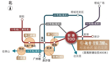 项目距地铁13号线新塘站仅约100米,步行即达,真正实现“地铁上盖”。更值得强调的是,新塘TOD是大湾区罕见的“十轨交汇”枢纽,未来将汇聚6条地铁(含13、16、20、23、28号线及6号线东延)、3条高铁(广深、广汕、京九)及2条城际(穗莞深、新白广),1小时内高效联通广州主城区、东莞、深圳等核心城市。地面交通同样便捷,广园快速、广深大道、荔新大道等主干道环绕,自驾出行无忧。公交系统亦完善,多条线路经停“新塘地铁站”“新塘南站”,通勤选择多元。