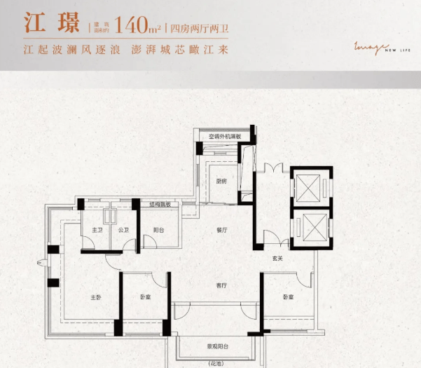 建面约142㎡板式大四房:专梯专户设计,北向一线望江,私密性与尊崇感兼备,满足高阶改善需求。