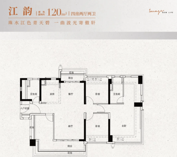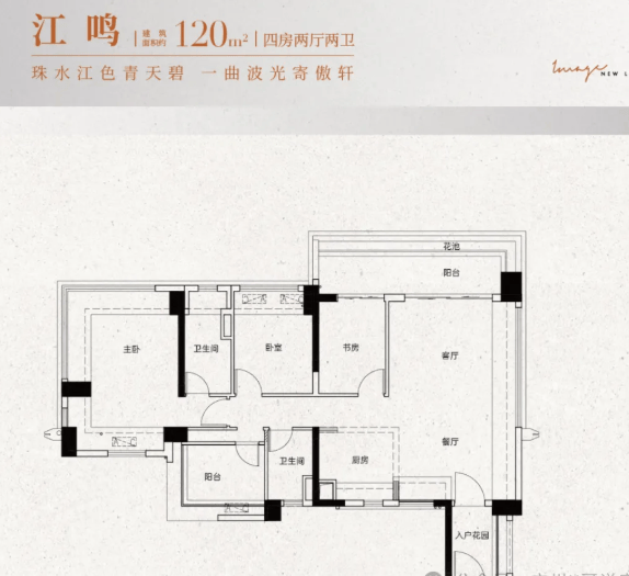 建面约118-122㎡四房:四开间朝南,动静分区清晰,主卧配备270°全景飘窗,将江景尽收眼底;