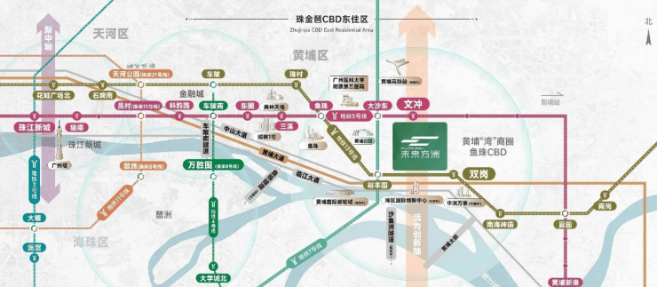 中建·未来方洲二期位于广州市黄埔区文冲东旧改片区,距离5号线文冲站B出口仅200米,步行即可到达。项目周边还有13号线双岗站,距离也仅有300米,形成了双地铁加持的优势。此外,规划中的黄埔高铁站预计在2026年动工,建成后将实现大湾区30分钟通勤圈,进一步提升项目的交通便捷性。