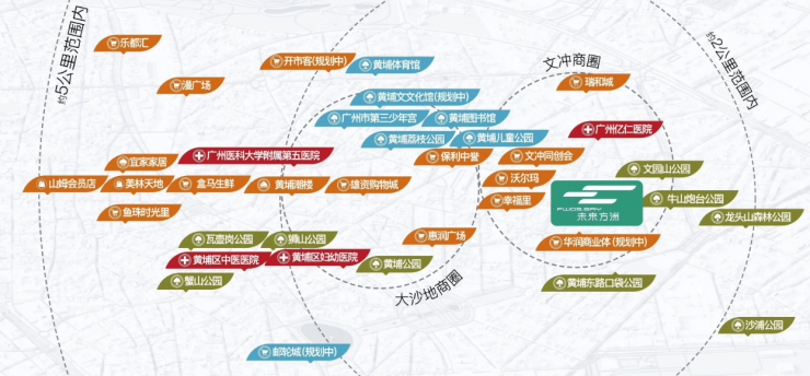 项目自身规划了约58万平方米的商办业态,并打造了一个游逛式商街,自成繁华生活圈。周边还有华润万象系商业(含12万平方米购物中心)、沃尔玛、万科里mall等大型商业综合体,满足居民日常购物需求。此外,项目周边有中大附属第一医院、广州医科大学附属第五医院等多家医疗机构,以及黄埔图书馆、广州市第三少年宫等文化设施,生活配套十分完善。