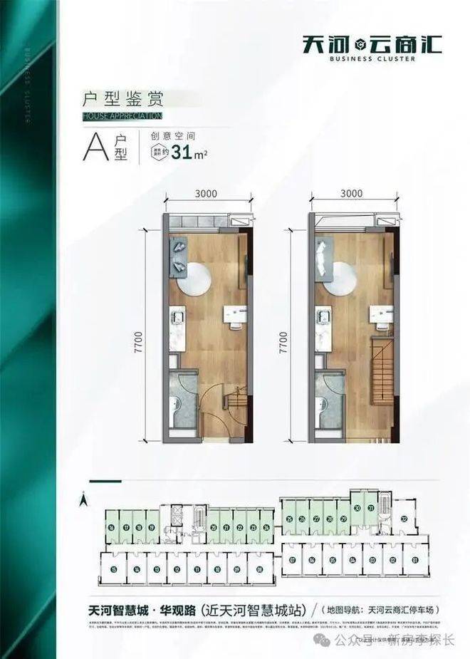 产品线分为两大类:一类是约31-58㎡的理想创意空间,另一类是约177-669㎡的花园独栋企业公馆。创意空间主打4.5米挑高设计,层高远超普通住宅,空间感极强。户型从31㎡到58㎡不等,小巧灵动,适合个人投资或小团队办公。A户型31㎡强调百变布局,小而精致;B户型43㎡方正舒适,采光通风优秀;C户型55㎡和D户型56㎡则在功能分区上更注重品质感,满足精英人群对生活与工作的双重需求。这些小户型全部现楼交付,即买即收租,个人名义购买没有任何障碍。