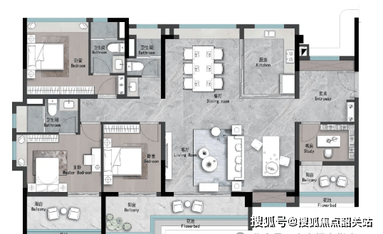 建面约142㎡四房两厅三卫:奢阔四房户型,空间宽敞,布局大气,三室卫生间设计,可满足多人口家庭的使用需求,避免早晚高峰期卫生间拥挤的问题,主卧带独立卫生间、衣帽间与飘窗,采光通风俱佳,客厅连接超大景观阳台,可欣赏社区园林美景,适合高端改善型家庭。
