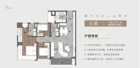 88㎡三房两厅两卫:刚需首选,南北通透,客厅连接景观阳台,主卧带独立卫浴,额外拓展空间可改储物间,适配三口之家;