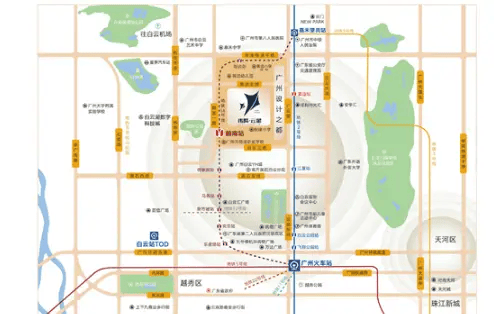 项目位于白云新城北拓轴线上,直线距离白云站TOD仅2.8公里(车程10分钟),距离设计之都1.5公里(车程6分钟),3公里内覆盖白云国际会议中心、广州市儿童公园、白云万达广场等顶级配套,堪称“白云芯的几何中心”。