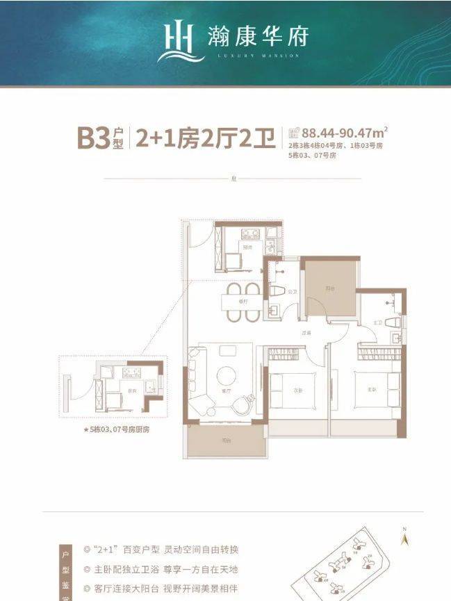 1 栋 03 号房(90㎡,2 + 1 房 2 厅 2 卫)