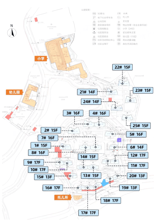幼儿园及小学: 自建一所15班幼儿园和一所24班小学,其中小学由天河外国语教育集团合作办学,确保了教育质量。