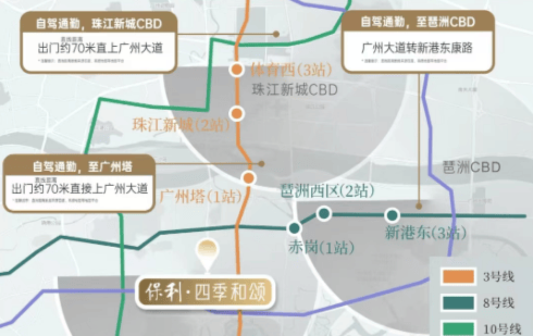 保利四季和颂周边拥有丰富的地铁线路,包括3号线、8号线、10号线和11号线四条地铁线,形成了便捷的交通网络。虽然四个地铁站距离楼盘都在1.5到1.8公里之间,但通过自驾或公共交通工具,居民可以轻松到达广州的主要商业区和生活圈。此外,楼盘靠近广州大道,驾车前往珠江新城、体育西、琶洲等地也十分方便。