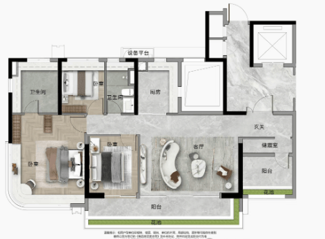建面约108-110平方米:爆款小户,带入户花园,空间使用率高,全屋采光优秀。