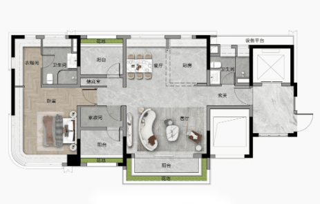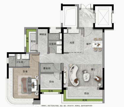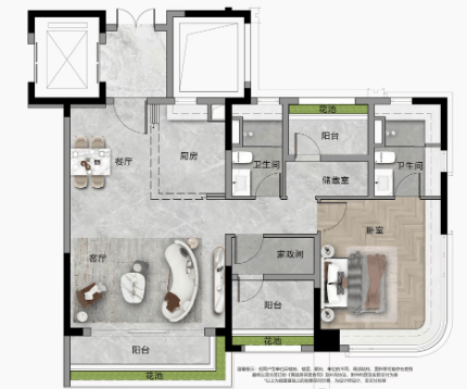 所有户型均采用LDKG大方厅设计,主卧配置270°转角飘窗,保证充足的光线和开阔的视野。