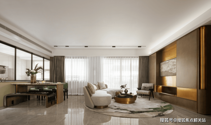 在客厅区域,这个户型样板间将北侧两间卧室打通合为一体,站在厨房的角度看客厅,视野非常的通透宽广。