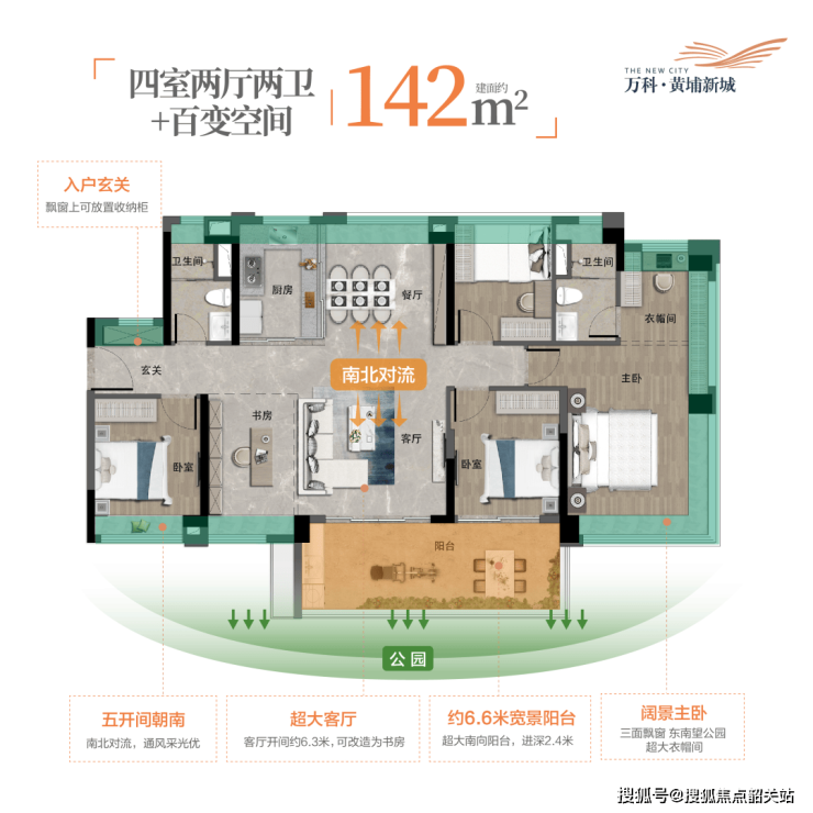 建面约142㎡产品做到了4+1房,还是一个真正意义上的南北对流产品。
