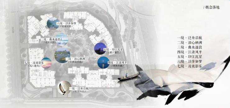 泛舟七境:提取江舟雅韵,打造涵咏自然水韵的岭南优雅格调七境园林;漫步游园,诗画江舟,描绘出快意舟游江水的归家水系。