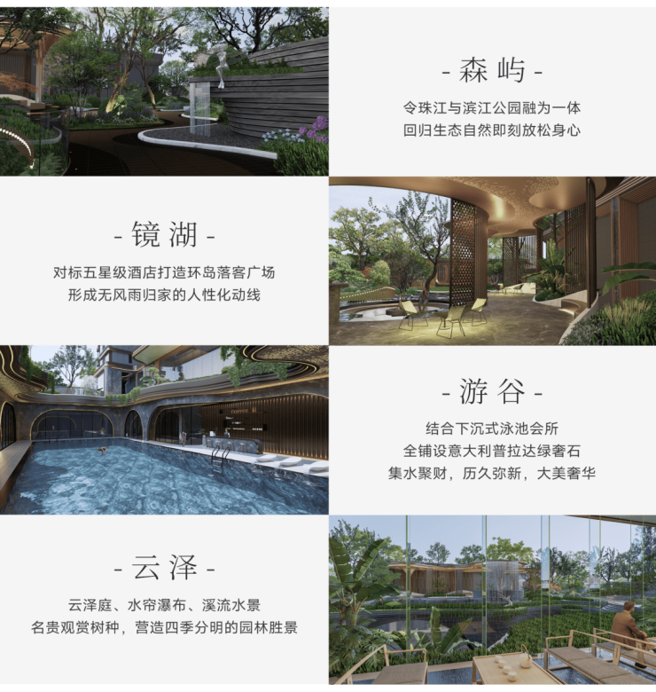 社区氛围讲究低密度、尊崇私享,设计大师团队量身打造“四重景观礼序”,通过森屿、镜湖、游谷、云泽四重景观动线,实现归家礼仪与空间美学的统一。居住者可在高阶社交空间中与同阶层圈层互动,同时拥有完全的隐私与安宁,为高净值客户打造心灵归属的生活环境。