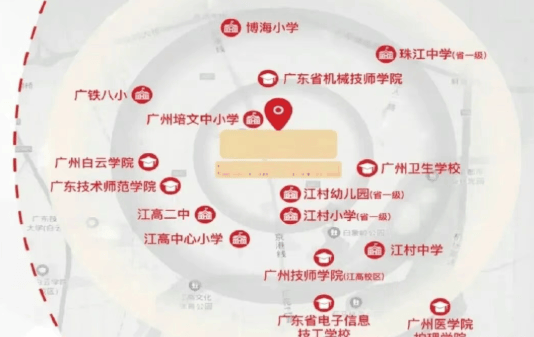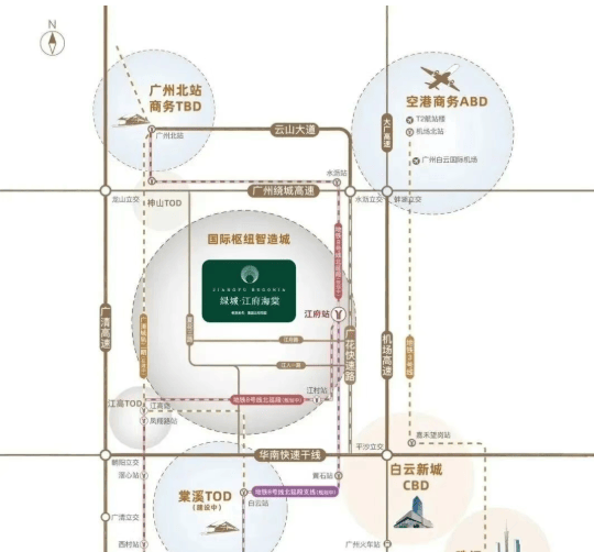 项目交通条件优越。距离在建的地铁8号线北延段及支线江府站约800米,目前工程进度约23%。未来通车后,6站可达珠江新城CBD,10站直达北京路商圈及广州市政府,高效连接越秀、海珠等核心城区。自驾方面,项目紧邻双向十车道的广花快速路,全程无红绿灯,10分钟直达白云新城,3分钟接入环城高速入口,30分钟通达珠江新城,2小时覆盖大湾区主要城市,出行极为便捷。