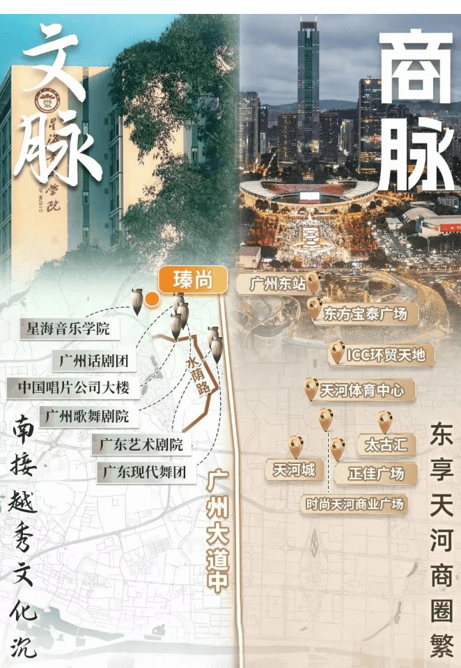 瑧尚,傲立于越秀和天河接壤的黄金地带,地理位置得天独厚。这里不仅有着稀缺的历史文脉,承载着广州百年文化艺术史,南端的水荫路更是广州文化艺术的起点,文化机构与艺术人群集聚,文化基因深厚且不可复制。同时,项目又能紧密触摸 CBD 的财富机遇,一面尽享天河商脉繁华,这种独特的融合使得瑧尚的价值更为凸显。