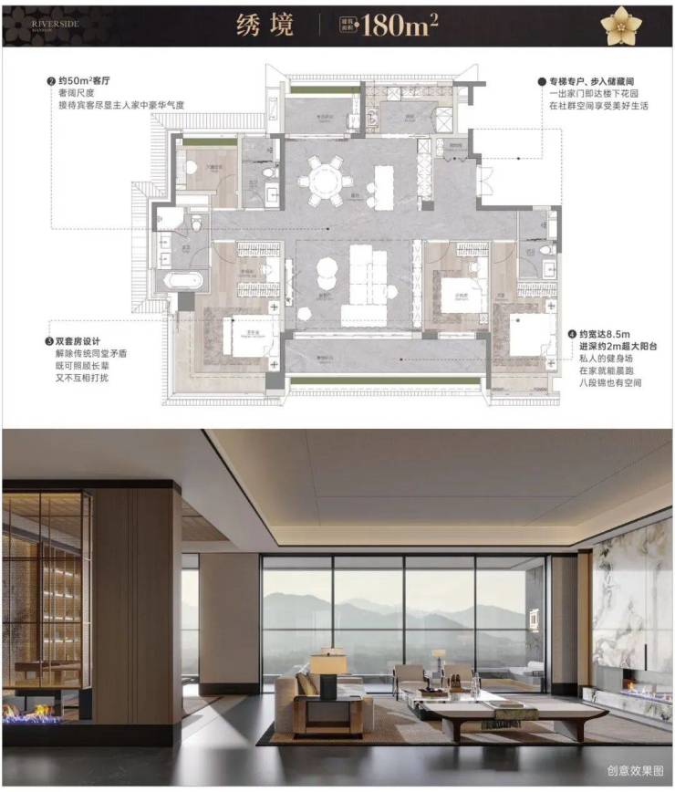 A:建面约110-180㎡,四房设计,均为南向一线江景户型。