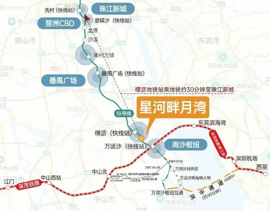 项目地处明珠湾区核心位置,临近广州地铁18号线,仅需一站即可抵达番禺广场,两站到达琶洲,三站直达珠江新城,实现快速连接广州核心区域。未来深江高铁接入南沙枢纽站后,将进一步提升项目的交通便捷性。