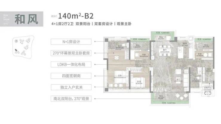建面140平4+1房,梯户比2梯2户,得房率约98%,四开间朝南,南向采光面达到15.7米,采光充足,南北双阳台设计,实现南北对流,通风效果极佳;LDKB一体化设计,空间通透开阔,可灵活打造休闲区、办公区等功能空间;主套配置270度折叠屏飘窗,视野极致开阔,独立卫浴与衣帽间设计,彰显尊崇感,同时额外赠送灵动空间,可根据家庭需求改造为书房、儿童房等,实用性拉满。装修标准高端,全系标配国际一线品牌家电、卫浴,细节打磨精益求精,让每一位业主都能享受高品质的居住体验。