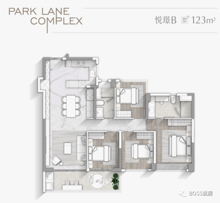 约111㎡四房:独创“一条梯腿”设计,私密性极佳;实现五开间东南朝向,横厅布局采光面宽,客厅旁灵动空间可并入起居区,增强空间感。