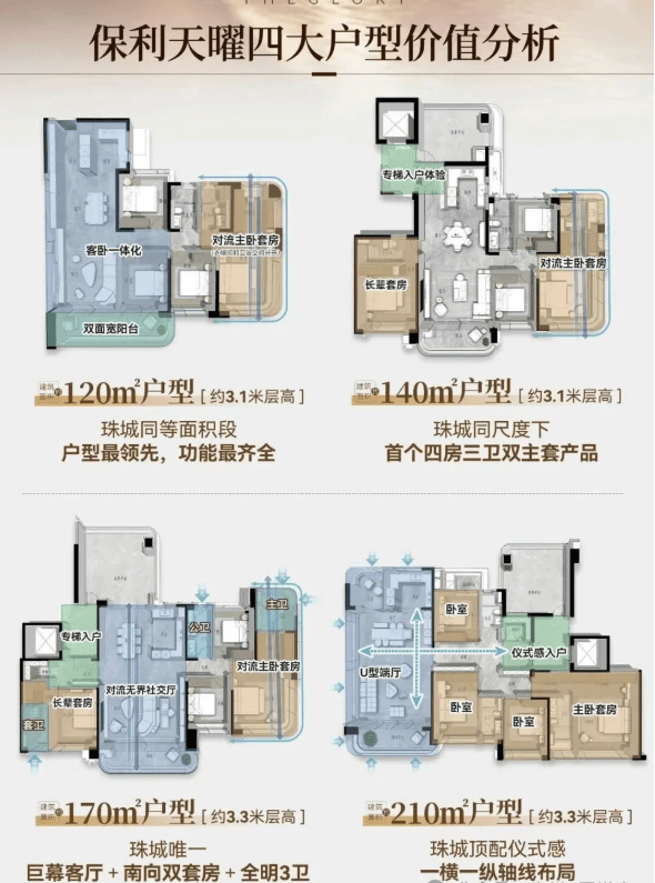 项目分为南北两个地块开发,总户数约968户。南地块为纯板楼设计,共8栋,主力户型为建面约120-210㎡四房,采用正南北T2布局,专梯入户,楼间距最宽超70米,有效保障通风、采光与景观视野。北地块为3栋塔楼(45-47层),采用T3/T4舒展式布局,通过楼栋错位设计降低互视干扰,户户南向单边位,最大化南向面宽。