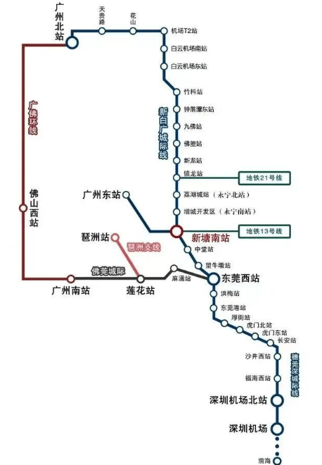 新白广城轨(在建中):1站到达白云机场,南向通达东莞和深圳。