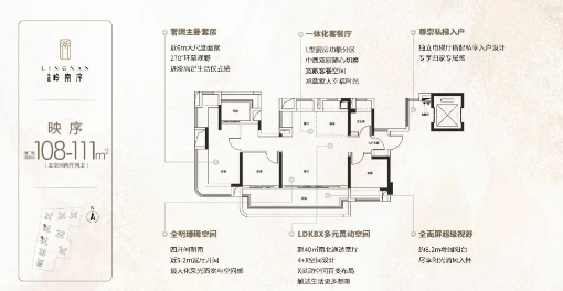 各户型特色:映序建面约 108 - 111㎡ 五空间两厅两卫;境序建面约 110㎡全景舱 五空间两厅两卫;云序建面约 118 - 121㎡全景舱 五空间两厅三卫;澜序建面约 141㎡全景舱户型 五空间两厅四卫,客厅、主卧豪华 U 型全景舱,餐厅旁设茶室,还有专梯入户电梯厅等实用空间。