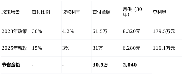 结论:新政下,购房者每月少还2040元,30年总利息节省63.4万元,相当于“首付省出一辆特斯拉,月供省出一部iPhone”。