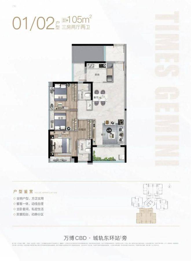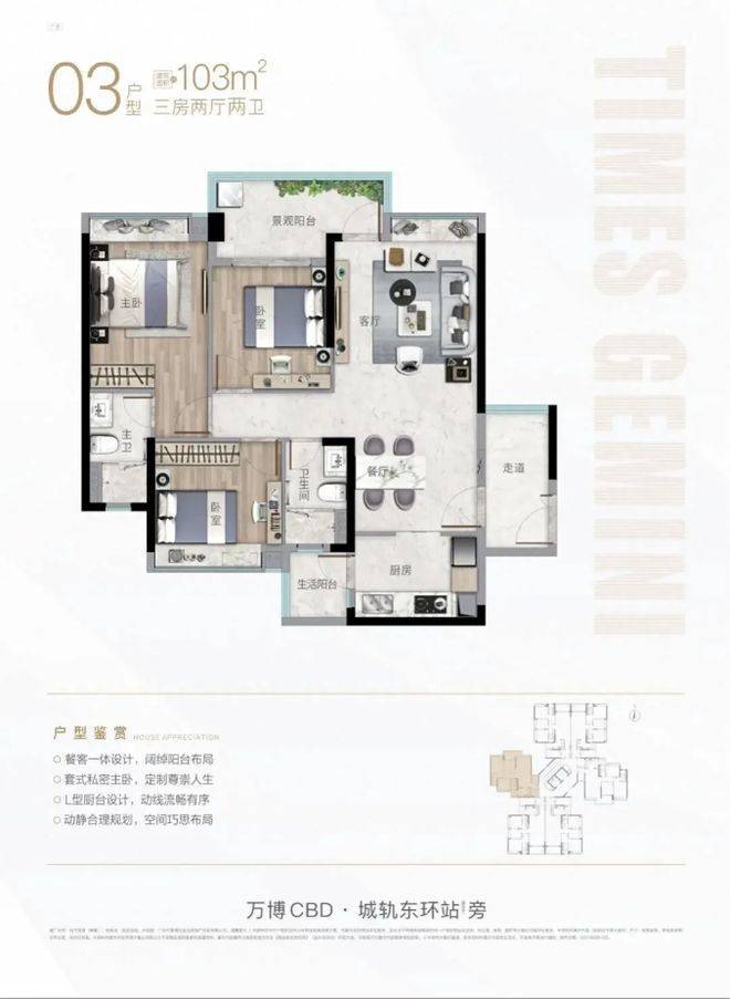 建面约103-107㎡三房户型,在空间布局上更加宽敞,功能更加完善,适合人口较多的刚需家庭。该户型方正通透,客厅大面宽设计,连接超大阳台,采光和通风效果极佳,可容纳多人聚会、休闲娱乐,彰显家庭的温馨氛围。厨房采用L型设计,操作空间充足,动线合理,适配广州家庭的烹饪习惯,同时靠近餐厅,方便用餐和收拾。主卧采用舒适套房设计,宽敞舒适,自带卫生间,保障了业主的私密性和舒适度,其他两间卧室尺寸宽敞,均配备观景窗户,可满足家人的居住需求,同时还可根据需求打造为儿童房、老人房、书房等,灵活多变,实用性极强。该户型的得房率达到80%,空间利用率极高,每一寸空间都能得到充分利用,让刚需家庭也能拥有宽敞、舒适的居住空间。