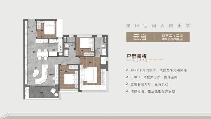 107㎡四房两厅两卫:总价约449-455万,LDKB一体化大方厅,可容纳8人聚餐,二胎家庭首选。
