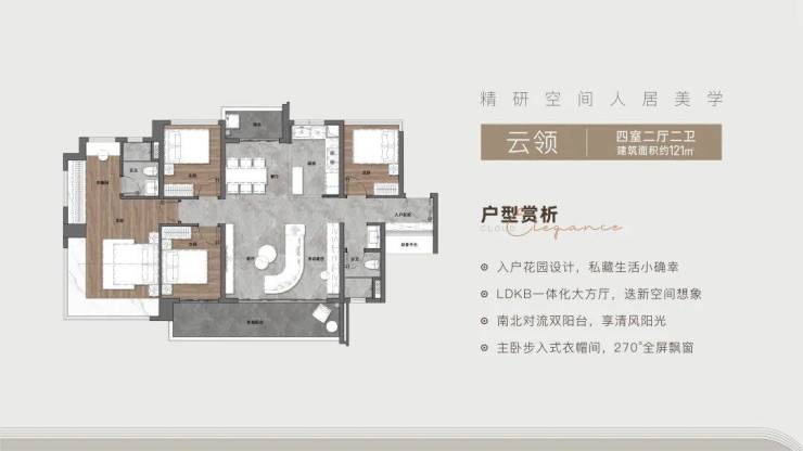 123㎡四房两厅两卫:总价约517-523万,南北对流双阳台,景观阳台开间达7.8米,采光通风极佳。
