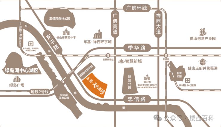 地铁——直线距离佛山地铁2号线智慧新城站约500米,可连通广佛线及佛山地铁3号线,迅达禅桂、顺德、广州南站、广州中心;与佛山地铁4号线(在建中)交汇智慧新城站,串联狮山及绿岛湖中心区;