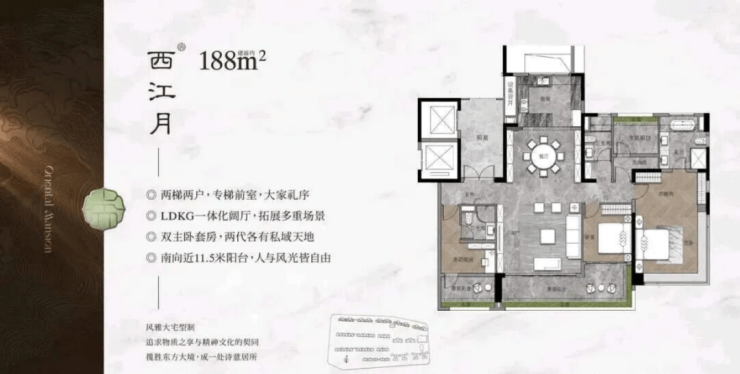188㎡四房三卫做到双主套设计,近10米面宽的阳台连接客厅与次卧,园林景观直入室内;