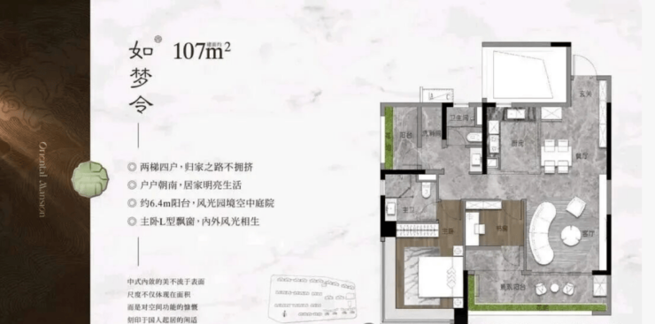 107㎡三房两卫是刚需友好型,三开间朝南,主卧带独立衣帽间,空间利用率高,两梯四户的配置满足日常出行;