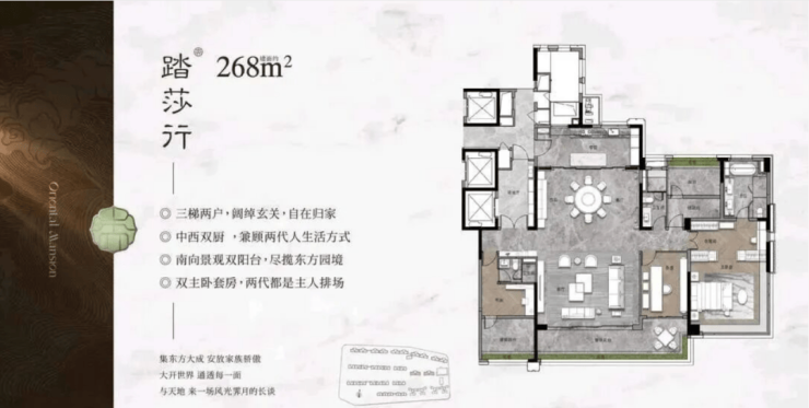 268㎡改善大平层则是项目旗舰户型,三梯两户配置含独立保姆电梯,LDKG大方厅面积近120㎡,主卧带270°全景飘窗和双台盆卫浴,居住质感拉满。