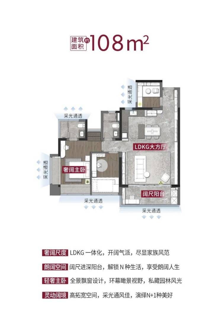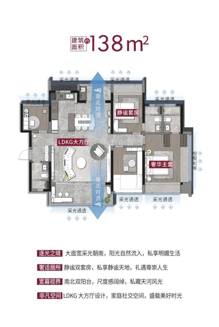 LDKG一体化设计超大方厅通透感十足,双主套空间满足三代同堂而居的理想,南北双阳台对流有效地划分空间功能,主卧270度宽阔飘窗大采光面。