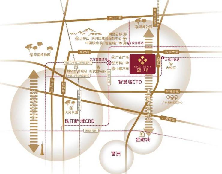 三地铁交汇,步行800米即达21号线天河智慧城站,10号线二期软件路站、29号线大观中路站规划中;四横四纵路网环绕,环城高速、广园快速、华南快速、科韵路、机场第二高速(在建);城市轨道接驳机场及广州南站,广佛东环设置天河智慧城站点,预计2025年开通;小区公交首末站,无缝接驳智慧城生活圈。