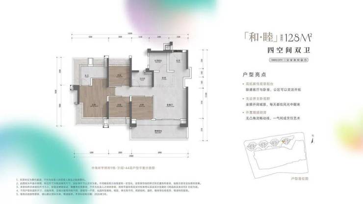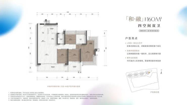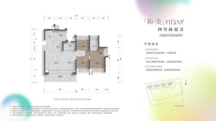 项目主推建面约 86㎡三房两卫、115㎡四房两卫、128㎡四房两卫、160㎡四房两卫四大户型,所有户型均为新规设计,空间使用率达 100%,3 梯 6 户的梯户比设计保障出行效率,得房率在区域内处于领先水平。建面约 86㎡三房两卫户型,采用大面宽通透格局,客厅搭配灵动可变空间,主卧拥有环幕观景视野,无遮挡俯瞰社区与城市景观,满足刚需家庭全周期居住需求;建面约 115㎡四房两卫户型,南北通透布局,双阳台设计,配备独立主卧套间,空间尺度舒适,兼顾实用性与舒适度;建面约 128㎡四房两卫户型,采用动静分区设计,室内空间阔绰,功能分区清晰,适合改善型家庭居住;建面约 160㎡四房两卫户型,打造 LDKB 一体化大方厅,搭配东南向宽景阳台,采光通风效果极佳,空间开阔大气,满足高端改善家庭的居住需求。项目搭载中海好房子系统,融合安全、舒适、绿色、智慧四大核心维度,装修标准采用中海 “和” 系高端精装,配备双向流新风系统、中央空调、品牌厨卫设备等。厨房配备燃气泄漏自动开窗、烟灶联动、熄火保护、水浸自动关阀、零冷水热水器、洗碗机、垃圾处理器等智能设备;卫生间全系宽度不低于 1.7 米,配备镜柜收纳系统、主卧智能马桶等细节配置;同时搭配智能入户门锁等安防设备,从每一个细节提升居住品质,实现精装交付即享高端生活体验。