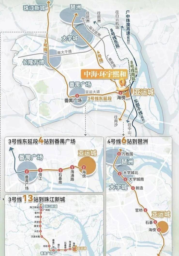 中海・环宇熙和坐落于广州番禺亚运城核心板块,亚运城历经 16 年发展,从昔日体育赛事场馆聚集地,蜕变为超 10 万人居住的全栖宜居新城,区域依托广州第三经济轴、狮子洋增长极核芯战略定位,北承广州主城繁华,南接南沙新区发展红利,是广州南部城市发展的重要战略节点,契合广州市十五五规划中南部宜居新城建设、轨道交通网络化、产业创新升级的发展方向,未来将持续享受城市规划红利,居住价值与发展潜力稳步提升。在交通配套方面,项目为真正的地铁上盖物业,距离地铁 3 号线、4 号线海傍站步行仅 300 米,是广州今年少有的双地铁 + 商业双上盖新盘。地铁 3 号线为广州核心通勤干线,作为始发站早高峰可保证有座,3 站直达大学城,5 站速达万博 CBD,8 站抵达金融城,串联广州塔、珠江新城、体育西等城市新中轴核心地标;地铁 4 号线衔接广州活力创新轴,快速接驳琶洲、万胜围等核心板块,贯通全城价值高地。自驾出行方面,项目周边亚运大道、新化快速、南大干线等城市主干道环绕,可快速通达广州市区、南沙区域乃至湾区其他城市,形成地铁 + 自驾的立体化交通网络,无论是日常通勤、商务出行还是休闲出游,都能实现高效便捷出行,居住于此可尽享主城半小时生活圈的便捷与繁华。