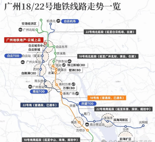 双高速地铁——18号线和22号线交汇于白云城市中心站,让出行变得更加便捷。通过这两条线路,您可以轻松直达广州各大CBD商圈以及重要交通枢纽,如白云机场、广州南站等。