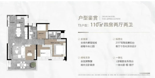 产品力:主推110-175㎡改善户型,拥有高得房率、全景玻璃幕墙及专梯独户设计。