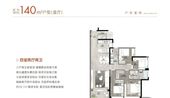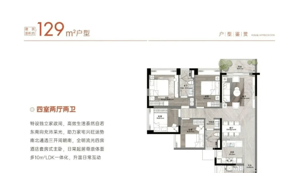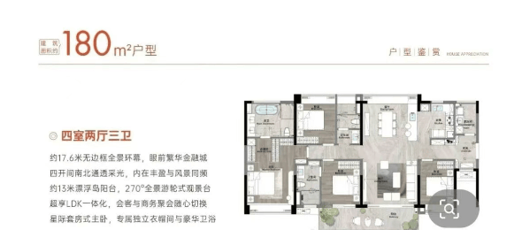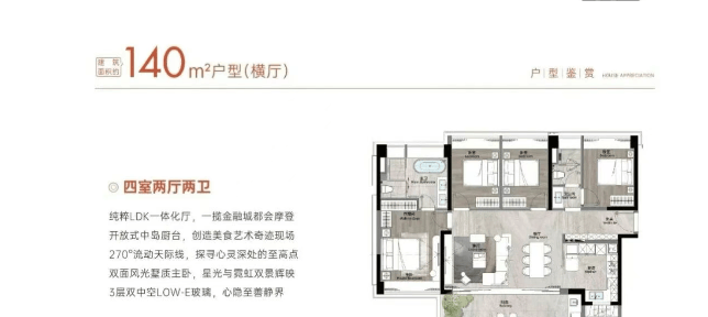 珠江天郦提供的户型面积从129平到180平不等,全部采用LDK一体化设计理念,强调空间利用率和居住舒适度。其中,129平四房户型亮点在于入户花园设计,增加了储物空间;140平四房则通过三面采光和直通南向阳台的设计,保证了充足的采光和通风;而180平四房更是配备了超长阳台和南北双主套设计,展现了豪华与实用的完美结合。所有户型均选用大金唯宝等国际知名品牌装修,确保高品质的交付标准。