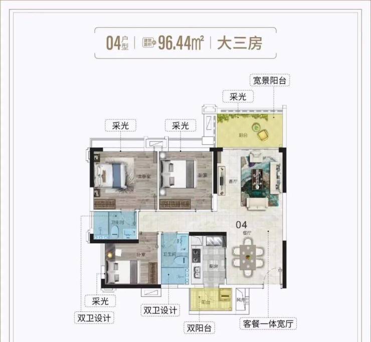 135平3+1房2厅:四开间观景设计,配备南北对流双阳台,主卧宽敞明亮,生活空间更大气。